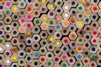 Achterzijde van gestapelde cederhouten kleurpotloden in rood, blauw, geel, groen, paars, zwart, wit, oranje, roze, als beeldvullende kleurrijke achtergrondfoto
