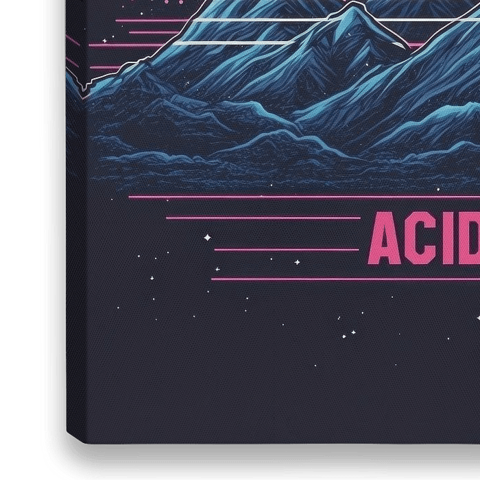 Dit kunstwerk straalt een retro, jaren '80-esthetiek uit, geïnspireerd door de visuele stijl van acid house en synthwave. Het beeld toont een indrukwekkende bergketen met scherpe pieken, die in het midden van de compositie centraal staan. De bergen zijn getekend in koele blauwe en paarse tinten, wat een sterk contrast vormt met de warme…