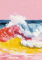 Acrylschilderij met roze lucht, gele zon, witte wolken en roze zee met golven. Eenvoudige penseelstreken, minimalistische stijl en fris kleurenpalet. De compositie doet denken aan kinderboekillustraties, met duidelijke vormen en een harmonieuze, speelse esthetiek. Close-up van de oceaan, opvallend, modern en decoratief.