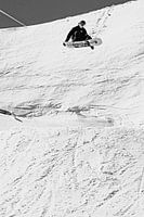 Actie foto snowboarder in de lucht. Snowboarder Niek van der Velden is de beste snowboarder van Nederland. Hij laat hier zijn kunsten zien in een funpark in Oostenrijk