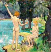 Beide mensen staan aan de waterkant, in de tuin van Eden.