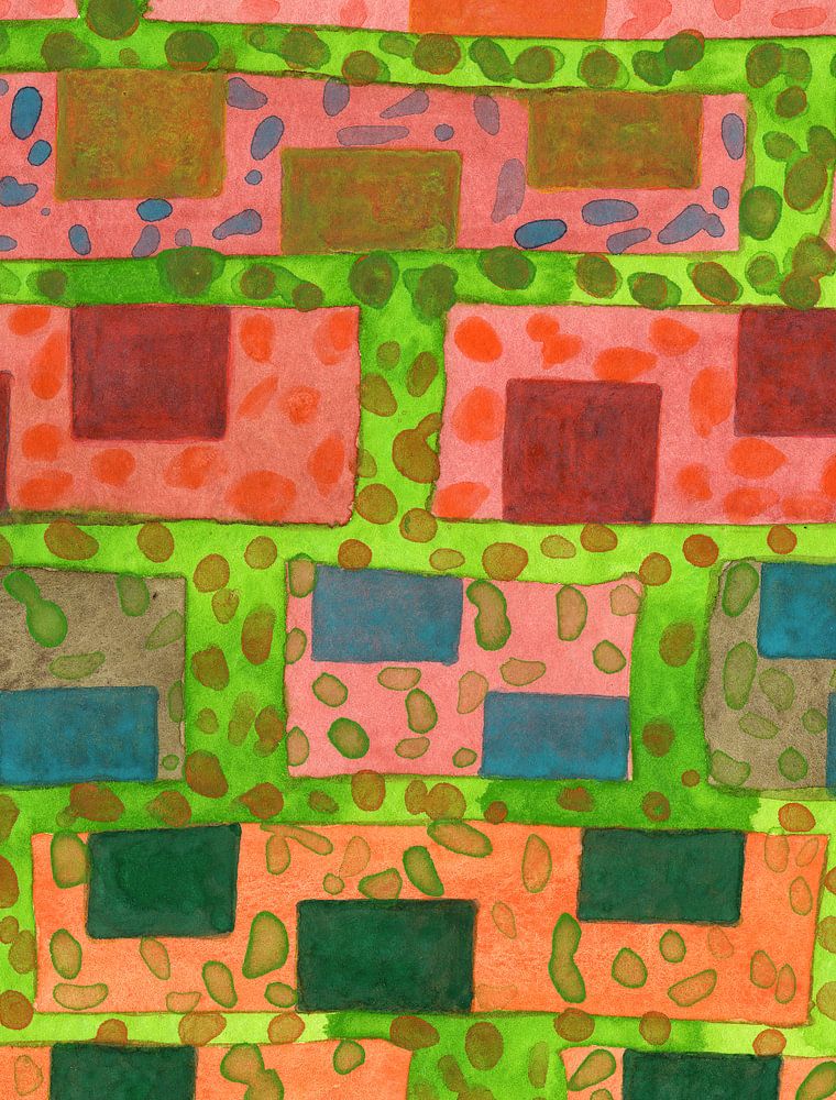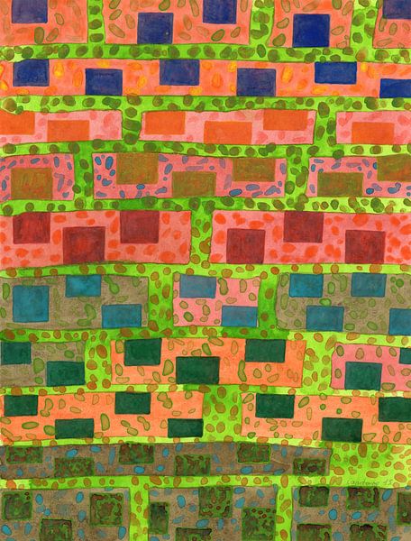 Upon the main structure of a brick wall out of colorful bricks and green mortar there are added colorful splashes and small rectangles. With the additional layer the image gains a rhythmic and melodious quality. The different shapes and colors are balanced out playfully.