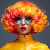 Een portret van een vrouw met levendig geel oranje en roze krullend haar, poserend in een geel latexpak en een blauwe bril. De belichting is zacht maar dramatisch en benadrukt haar gewaagde make-up en modieuze outfit. Haar uitdrukking straalt zelfvertrouwen en speelsheid uit, wat bijdraagt ​​aan de algehele stijl van modefotografie.