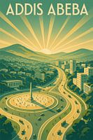 Deze Addis Abeba Art Deco poster straalt de geest van de hooggelegen hoofdstad van Ethiopië uit, genesteld tussen glooiende groene heuvels en badend in het licht van een gouden zonsopgang. De kronkelende boulevards en ronde pleinen van de stad weerspiegelen zowel het trotse erfgoed als de moderne dynamiek. Zonnestralen strekken zich uit over de horizon en verlichten het hart van de diplomatieke hoofdstad van Afrika.