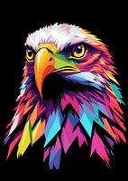 Een adelaar die in pop-artstijl is afgebeeld heeft felle kleuren, sterke contouren en elementen uit de populaire cultuur. Deze artistieke weergave bevat vaak levendige kleuren, overdreven kenmerken en een dynamische compositie, waardoor de geest van de adelaar op een visueel opvallende en eigentijdse manier wordt vastgelegd.