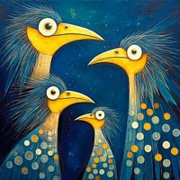 Vier gestileerde vogels met grote ogen en felgele snavels staan tegen een diepblauwe achtergrond. Hun lichamen zijn versierd met ronde, kleurrijke vlekken die een grillig tintje toevoegen.