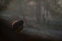 Adelaarsuil ( Bubo bubo ) zittend vroeg in de ochtend in het eerste licht, achtergrondfoto, mooie lichte krans in het verenkleed, licht, delicaat, mistig humeur, Europa.