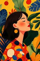 Dit kunstwerk schildert een vreugdevolle vrouw in extase, omringd door een werveling van levendige kleuren en tropische bladeren. Haar gezicht straalt geluk uit en haar lichaam is ondergedompeld in de warme, fonkelende omgeving, die een stemming van liefde en levensvreugde uitstraalt.