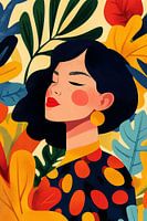 Dit kleurrijke kunstwerk toont een vredige, herademende vrouw die lijkt te genieten van de omringende felle kleuren en organische vormen. Het straalt een gevoel van ontspanning en harmonie uit, met een vleugje tropische sfeer. De nadruk ligt op de levendige kleuren en de expressieve stijl waarmee de vrouw en haar omgeving worden…
