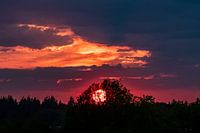 Ontdek de betoverende schoonheid van een zonsondergang die de lucht vult met een schitterende gloed van oranje en roze tinten, perfect vastgelegd achter een silhouet van weelderige bomen. Deze adembenemende foto vangt de magie van de natuur op zijn best, met dramatische wolkenpartijen die het tafereel compleet maken. Ideaal voor liefhebbers van natuur- en landschapsfotografie, deze afbeelding biedt een serene en inspirerende kijk op de dag die ten einde loopt. Voeg een vleugje natuurlijke schoonheid toe aan uw dag met deze inspirerende zonsondergang foto.
