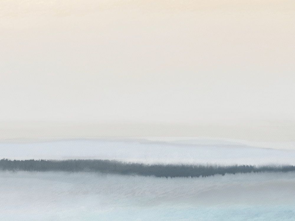 Abstract minimalistisch landschapschilderij met zachte kleurtonen in blauw en groen. Aquarel op papier.