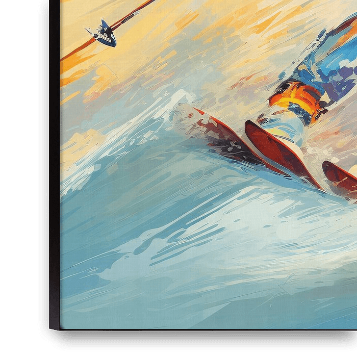 Duik in de wereld van wintersport met dit levendige abstracte schilderij. Voel de snelheid, de kou en de passie van de sport. De dikke verf in impasto stijl voegt diepte en textuur toe, ideaal voor een Canvas met baklijst.