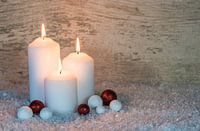 Advent en Kerstmis seizoen decoratie met drie kaars vlammen, rode en witte ballen, sneeuw en houten achtergrond, kerstkaart, kerst ornamenten, kerstversiering, wenskaart