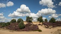 Een mooie blauwe lucht met wolken. De heide staat in de bloei.