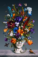 In alle stilte herinner ik me je gezicht. Met klassieke trekken en serene uitdrukking is degene van wie ik hield in steen veranderd. In deze verlatenheid barst het leven los in een levendige weergave - bloemen van verschillende soorten en kleuren verstrengelen zich in een weelderige, chaotische harmonie. Vogels, vlinders en andere insecten voegen een dynamisch, etherisch gevoel toe, in contrast met de stilheid van het standbeeld. De levendige oranje, paarse en blauwe bloemen creëren een betoverend tapijt, zorgvuldig vervaardigd om beweging en groei uit te drukken. Het leven kan bloeien uit een enkele traan.