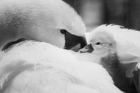 Vreemd genoeg kijkt het zwanenkuiken onder de vleugel van zijn moeder vandaan.