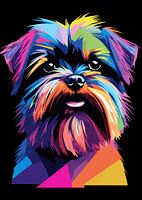 Een affenpinscher afgebeeld in pop-art stijl heeft felle kleuren, sterke contouren en elementen uit de populaire cultuur. Deze artistieke weergave bevat vaak levendige kleuren, overdreven kenmerken en een dynamische compositie, die de geest van de affenpinscher vastlegt op een visueel opvallende en eigentijdse manier.