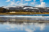 Het landschap op Varanger is afwisselend. Hier ligt een dorp prachtig tussen de bergen en een strand.