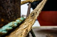 Rauw in de haven afgemeerd staalkabels meerlijnen scheepstrossen en bolders. Lopend langs de havenkade de geluiden van de schepen.