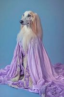 Met zijn majestueuze gratie en vederlichte, zijdeachtige vacht presenteert de Afghaanse windhond zich in al zijn pracht. Zijn elegante oren vallen zachtjes, terwijl een vleugje glamour wordt toegevoegd door de paarse draperie. De onmiskenbare gezichtsuitdrukking straalt zowel intelligentie als waardigheid uit, waardoor deze nobele…