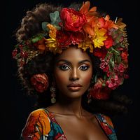 Afrikaans model met fraai gekleurde bloemen tooi op haar hoofd. Modern, trendy en zeer decoratief in ieder interieur. Het beeld is gegenereerd dmv Ai of kunstmatige intelligentie.