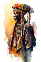 De aquarel toont een prachtig beeld van een Afrikaanse man in traditionele, kleurrijke klederdracht. De man draagt een lange, losse tuniek met zachte kleuren. Zijn hoofd is bedekt met een muts met vele kleuren. Verder draagt hij een imposante halsketting met vele kleuren.