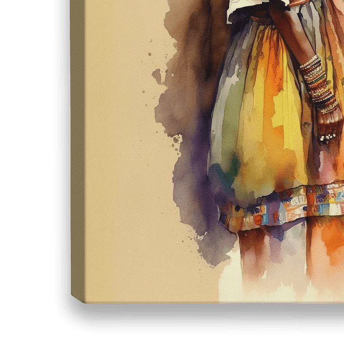De aquarel toont een prachtig beeld van een Afrikaanse vrouw, gekleed in traditionele, kleurrijke klederdracht. Ze is gehuld in een weelderige jurk met vloeiende lijnen en felle kleuren. Haar hoofd is bedekt met een geornamenteerde hoofddeksel met een prachtig patroon dat matcht met haar jurk.