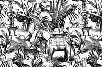 Vintage illustratie in zwart-wit met palmen en exotische dieren uit India en Afrika die elkaar ontmoeten in een surrealistisch tropisch paradijs.