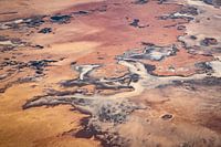 De Sahara in Afrika gezien vanuit een vliegtuig op 10 kilometer hoogte. Wat een indrukwekkend landschap! De warme oranje kleur van het zand van de woestijn is overweldigend mooi en de woestijn strekt zich uit over het grootste deel van Afrika. Over de Sahara vliegend lijkt er geen einde aan de woestijn te komen, genietend van het uitzicht op weg naar verre bestemmingen.