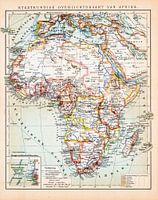 Op deze antieke kaart uit ca. 1900 staat Afrika aan het begin van de 20ste eeuw afgebeeld. Het betreft hier dan ook een weergave van de koloniale grootmachten en de verdeling hieronder van het Afrikaanse continent.