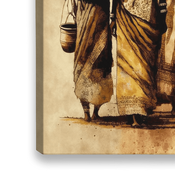 Het kunstwerk is een kleurrijk aquarel die een tafereel uit Afrika weergeeft, vastgelegd met uitgebreid palet van warme en rijke kleuren. De aquarel heeft een prachtig palet van aardetinten, die de warmte van het landschap perfect weergeven. Het geeft een gevoel van warmte en opwinding dat zo kenmerkend is voor dit deel van de wereld.