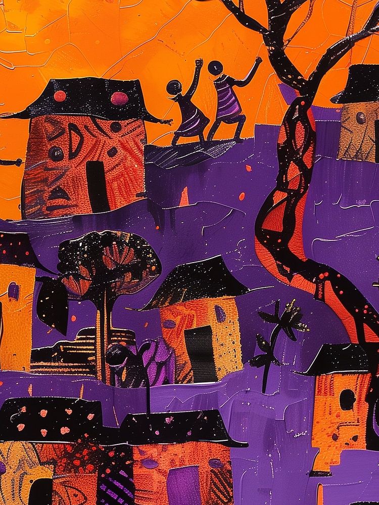 Dit schilderij is een levendige interpretatie van een Afrikaans dorp bij zonsondergang. In levendige oranje en violette tinten brengt het werk de warmte en levendigheid van het Afrikaanse continent over. De silhouetten van huizen en bomen creëren een kalme, vredige sfeer. Ideaal voor een exotische, culturele sfeer die doet denken aan verre oorden.
