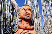 Een primitief houten beeld / standbeeld met het gezicht van een etnisch Afrikaanse man uit exotisch Afrika, Windhoek, Namibië. Tribale Afrikaanse kunst in warme terra kleuren tegen een natuurlijke bamboe achtergrond en blauwe lucht. Handwerk, ambacht.