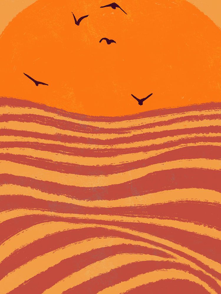 Afrikaans landschap met abstract golvende golven met vogels en oranje ondergaande zon.