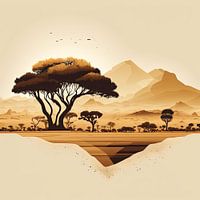 An African wild landscape with trees and mountains in a minimalist style. Brown, mocha, beige color scheme, poster style print in square format.