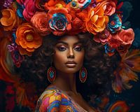 Afrikaans model met prachtige bloemenpracht op haar hoofd. Kleurrijk, trendy en stylish aan de muur.