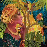Op deze fantasietekening zie je het profiel van een Afrikaanse vrouw met haarband en opvallende sieraden. Op de achtergrond -tussen de tropische bladeren- zie je 2 papegaaien.