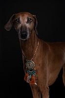 Portret Afrikaanse Azawakh hond met halsketting tegen zwarte achtergrond