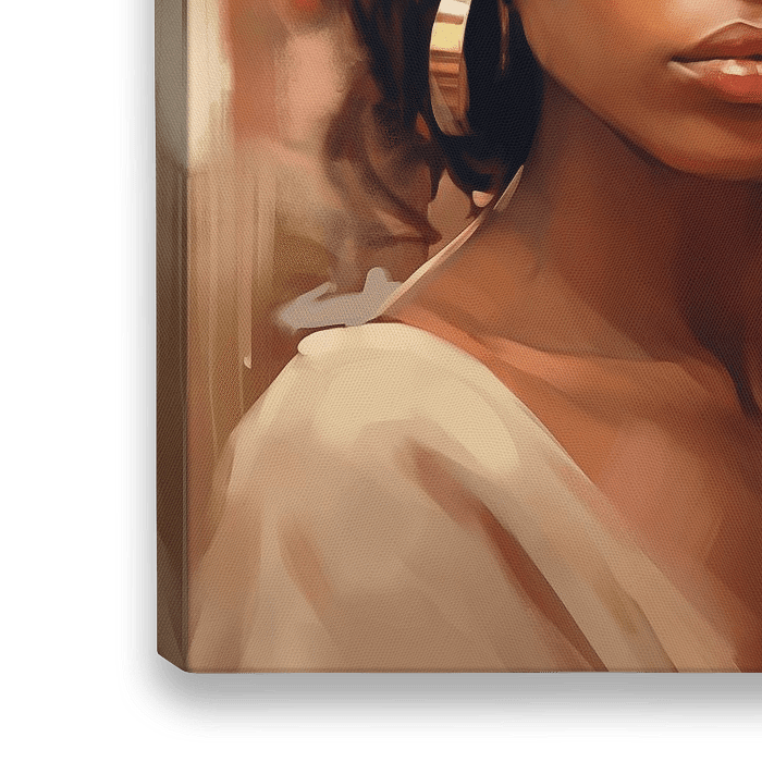 Het kunstwerk toont een vrouw met een zelfverzekerde blik, haar hoofd sierlijk versierd met een bloemenhoofddoek. De warme, aardse tinten en de zachte, diffuse penseelstreken creëren een intieme en persoonlijke sfeer. Het portret is realistisch, met een vleugje impressionisme door de manier waarop de kleuren en het licht spelen, en…