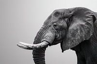 Op de zwart-wit foto staat een majestueuze Afrikaanse olifant tegen een zwarte achtergrond. Zijn ruwe huid is rijk aan textuur, met diepe rimpels en groeven die door het licht worden benadrukt. De imposante slagtanden glinsteren wit tegen de donkere achtergrond, terwijl de grote, flapperende oren een gevoel van beweging en kracht geven. De ogen van de olifant, vol wijsheid en geschiedenis, kijken rustig de camera in. Het witte doek laat het indrukwekkende silhouet van de olifant scherp afsteken, wat zijn grootte en grandeur versterkt in een beeld van tijdloze elegantie.