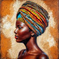 Dit werk nodigt uit om van dichtbij te bewonderen en de gelaagdheid in de texturen te ontdekken. Een portret dat niet alleen visueel intrigeert, maar ook een verhaal vertelt over identiteit, trots en schoonheid.