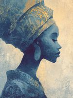 Dit betoverende portret vangt de kracht en gratie van een Afrikaanse vrouw in profiel, met een rijk gedecoreerde blauwe hoofddoek en grote oorbel. De combinatie van blauw- en goudtinten geeft het werk een tijdloze, stijlvolle uitstraling vol culturele diepgang.