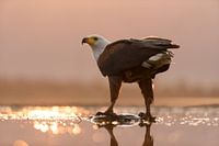 Afrikaanse Zeearend staand op zijn prooi in Zuid-Afrika tijdens zonsondergang.