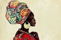 Dit levendige portret toont een Afrikaanse vrouw in profielaanzicht, gekleed in een kleurrijk gewaad en een uitgebreid vastgebonden hoofdtooi. De gedetailleerde patronen en felle kleuren van de kleding harmoniëren perfect met de delicate, handgemaakte sieraden. De uitdrukking van de vrouw straalt trots en gratie uit, terwijl de artistieke afbeelding haar culturele identiteit en schoonheid benadrukt. Dit werk is ideaal voor liefhebbers van Afrikaanse kunst en mode en voegt een exotische en inspirerende sfeer toe aan elke kamer.