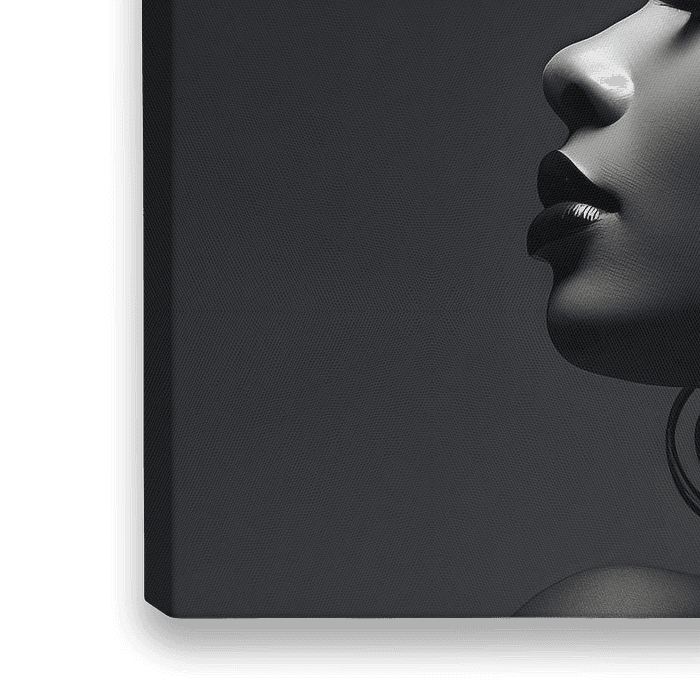 In deze indrukwekkende zwart-witafbeelding staat een Afrikaanse vrouw centraal, haar profiel prachtig gevangen in het beeld. Ze straalt een onmiskenbare elegantie uit met haar oogverblindende sieraden en verfijnde make-up. Haar haar is op meesterlijke wijze opgestoken in een intrigerende spiraalvorm, wat haar een koninklijke uitstraling geeft. Het scherpe contrast van zwart en de grijstinten benadrukt de tijdloze schoonheid van haar gezicht.