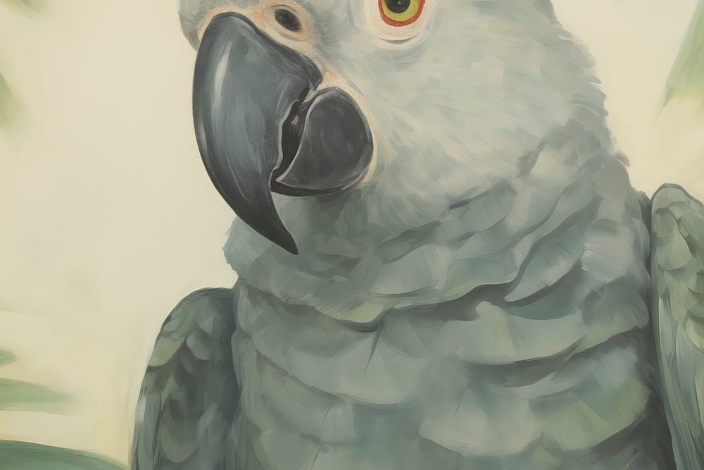 Een digitaal schilderij van een Afrikaanse grijze papegaai omringt door groene bladeren. Het werk geeft een dromerige en rustieke uitstraling aan uw interieur!