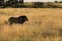 In de ochtend loopt een leeuw met de karakteristieke zwarte manen door het gras van de kalahari woestijn in Botswana, Afrika.