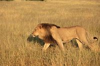 In de ochtend zon loopt een leeuw met de karakteristieke zwarte manen door het gras van de kalahari woestijn in Botswana, Afrika.