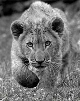 Afrikaanse leeuwenwelpje komt naar je toe in zwart wit