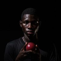 Unieke afrikaanse man met een appel schilderij met een prachtige stijl. Met prachtige kleurtinten en een uniek ontwerp maakt dit tot een stijlvolle fotoprint die prachtig staat in elke ruimte.